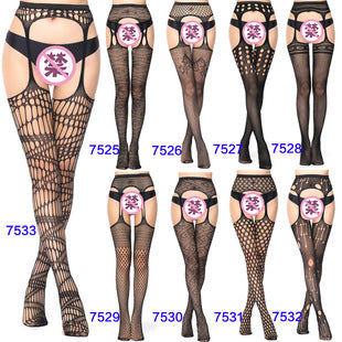 European and American Style Open Crotch Lace Transparent Suspender Black Silk Sexy Fishnet Stockings Non-Slip One-Piece Garter Belt for Women7546