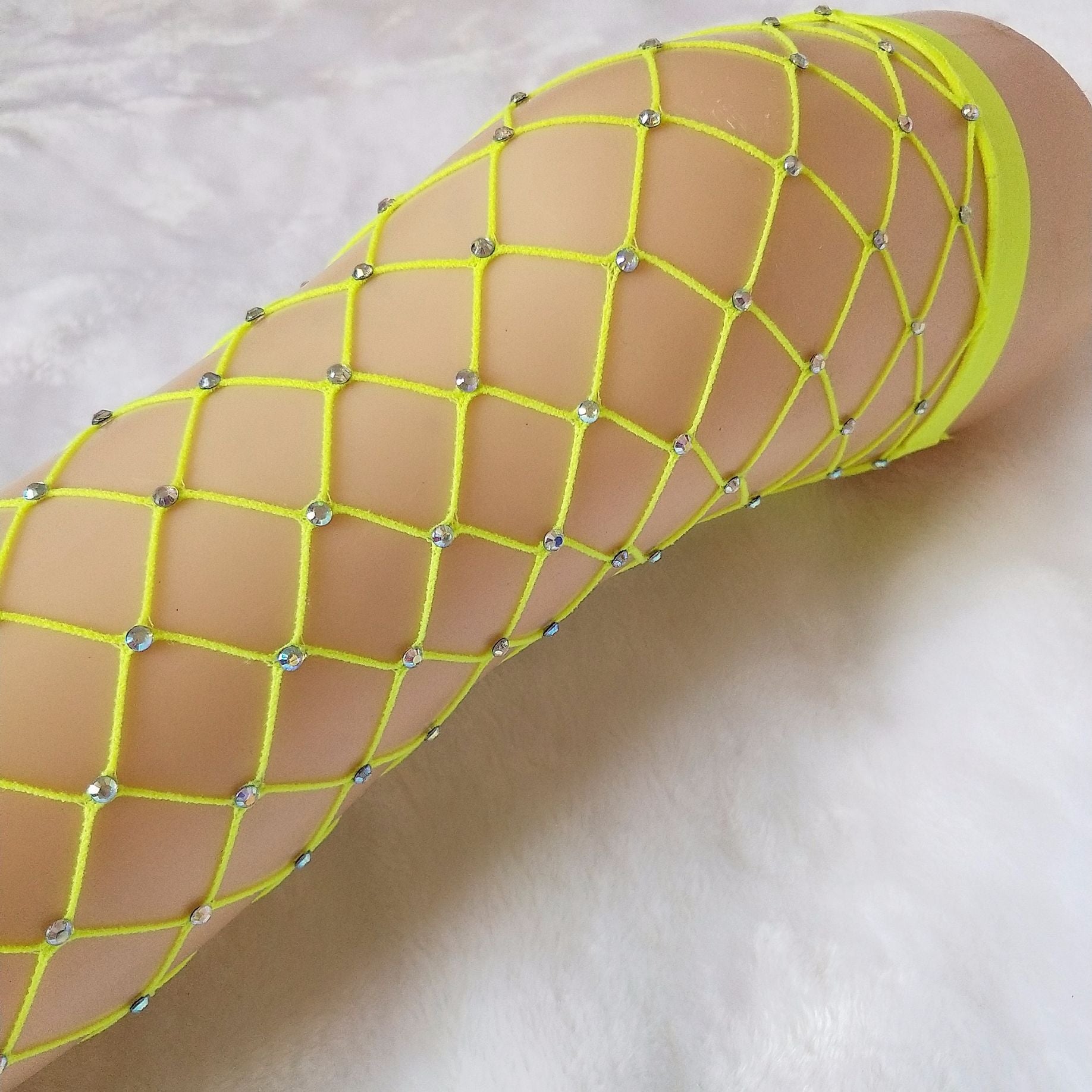 Rhinestone-embellished large-mesh fishnet stockings